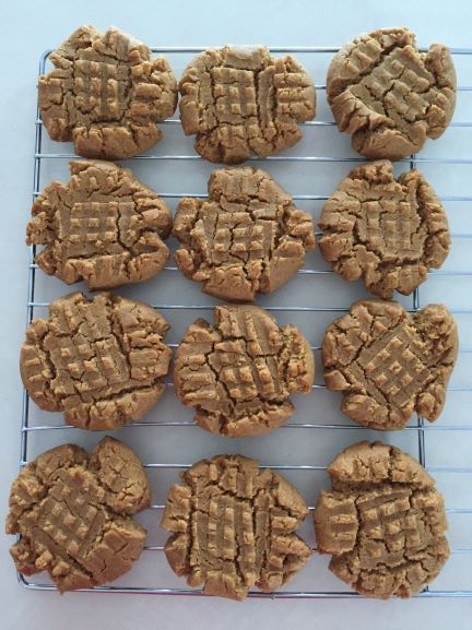 With a mixer, blend 1 C. peanut butter with 1/2 C. white sugar and 1/4 C. brown sugar. Add 1 egg, 1 teaspoon of baking soda and 1/2 teaspoon vanilla. Mix well. Preheat oven to 350 degrees. Roll dough into medium sized balls and place on a cookie sheet covered with parchment paper. Use a fork to press the dough down making a crisscross pattern on top of each ball. Bake for 9-10 minutes. Allow to cool on the cookie sheet for 3-4 minutes before transferring to a wire cooling rack to cool completely. Store in an airtight container. Since this is the first time I’ve made them, I’m not sure how long they will keep. I only got 17 cookies out of my batch so you’ll probably want to double or triple the recipe!