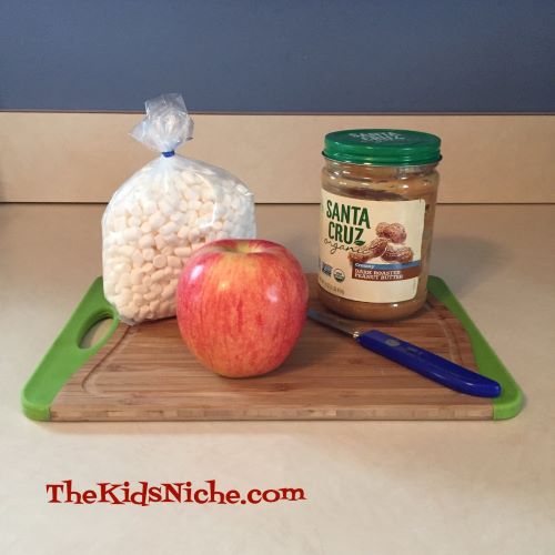 All you need to get started is an apple, some peanut butter and some miniature marshmallows. I used the teeny tiny marshmallows, like the kind that go in hot chocolate.