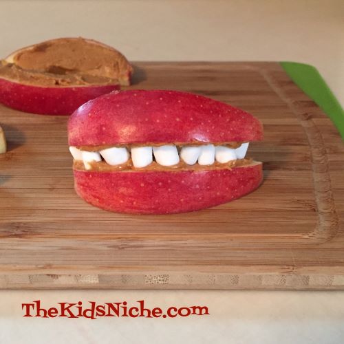 Lay the second apple slice on top of the marshmallows and…ta dah! You have an apple mouth! 🙂