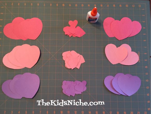 Put the hearts into the same size and color groups for ease in putting your Valentines together.