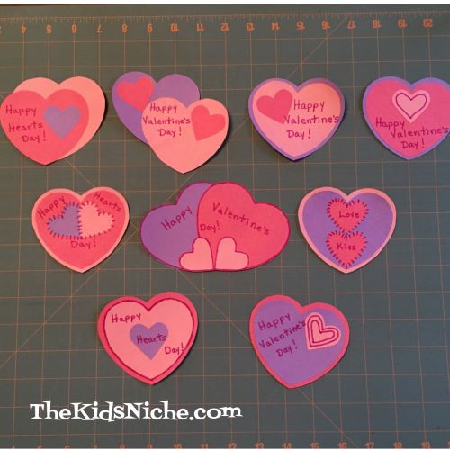 Tomorrow is the day of love and hearts, candy and flowers – Valentine’s Day! Are you looking for some inexpensive fun for the kids? Today I’m sharing one simple way to make some homemade Valentines. I used 3 colors of construction paper (red, pink & purple), 2 different sized cookie cutters, a pencil, scissors, glue and a marker. First I traced around the larger heart shaped cookie cutter 3 times on each piece of paper using a pencil. Then I discovered if I turned my cookie cutter over, I could trace around that side and get a slightly smaller heart shape. I filled up the space that was left on each color of paper by tracing around a much smaller heart shaped cookie cutter.