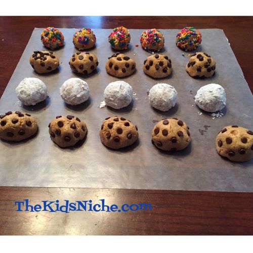 Roll in desired coating or leave plain. For coatings, I used miniature dark chocolate chips, miniature milk chocolate chips, powdered sugar and colored sprinkles.