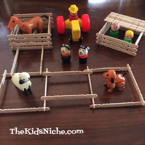 The craft sticks make a quick and easy fence for those farm animals or an easy house for the farmer and his wife. π (I know…the horse and the sheep don’t have any ears…they used to but they have been well loved through the years!)
