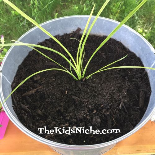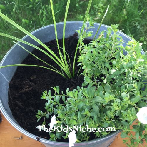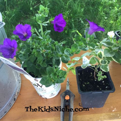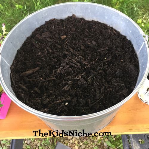 This is a great time of year to encourage kids to learn more about plants and how they can beautify our outdoors. There is just something so special about getting your hands into some dirt! It’s very therapeutic for me! So here’s a crash course on making an awesome pot of flowers. 😉 First decide where you can put a pot of flowers. Check to see if its mostly sunny or mostly shaded there for the bigger part of the day. You can buy a pot for your flowers or look around your house and see what you already have that might work. I chose a galvanized metal tub that we had that adds a nice country look to our flowerbed. You’ll need a bag of dirt or potting soil to fill the container 3/4’s full.