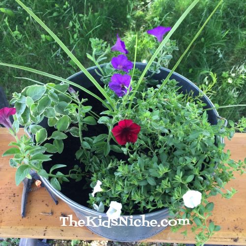 Ta Dah! You did it! You now have a beautiful planter to add some color to your out-of-doors area. Don’t forget to water the pot well after you have it settled in its new place. Don’t worry if it looks like you have a bit too much room between the plants because they will fill it in as they grow throughout the summer. I made 4 tubs like this and they are sitting along our split rail fence in front of our house. I’m adding some small American flags for a lovely patriotic area. Kids will enjoy this project especially if they are involved in it from picking out the plants, to planting, and finally sitting the finished pot out for all to enjoy. 🙂 Have fun!