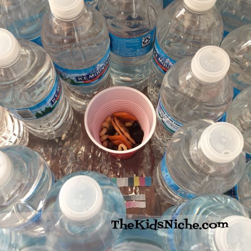 I found some fruit gummies, Cheez-its crackers, chocolate chips, cereal, raisins, cashews and Honey Nut Thins crackers. You can tailor the items to fit your child’s age. Tiny marshmallows or cheese cubes on a toothpick were some of our kids favorite items for this game. Put all your snack food into the cup.