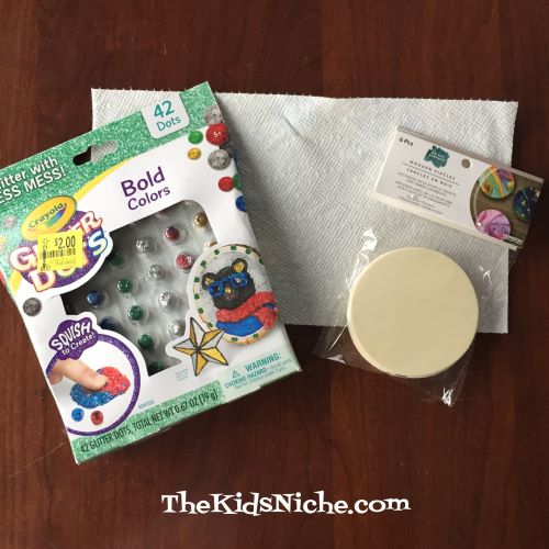 It says to just peel back the foil covering the individual dot, place it on your project and squish it in place. Here is what I used to try them out…a paper towel underneath to catch any run-away glitter and a wooden circle to color with the dots.