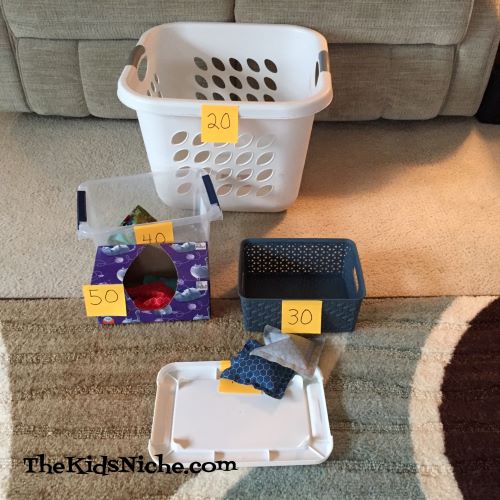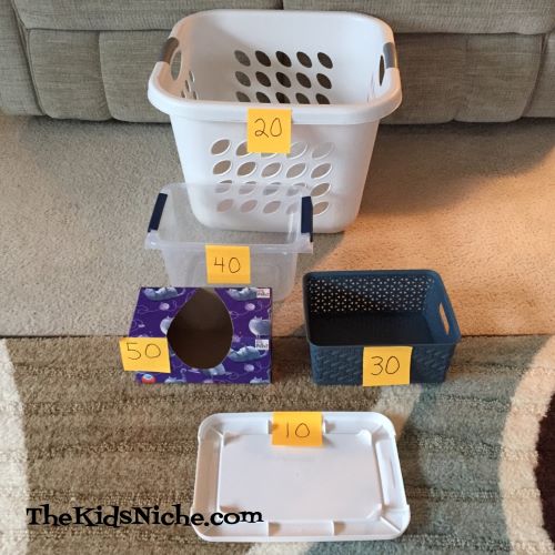 You can add point scores for each item with the smaller openings having the higher score value. As you can see, I used a laundry basket, 2 plastic containers with a bit different size openings, an empty tissue box and the lid to one of the plastic containers.