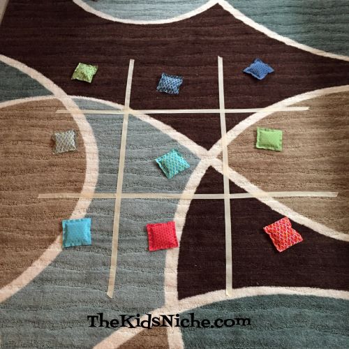 9.) Bean Bag Tic Tac Toe – This is another game that is pretty self-explanatory if you know how to play Tic Tac Toe. If you don’t know, the game is played on a grid using X’s and O’s and players take turns placing their marker in the grid. The first person to get 3 in a row is the winner. So for playing with bean bags, you need 5 bags each of 2 different colors or shapes so you know which bean bag belongs to which player. You can use anything that makes a straight line to form the grid. Like 4 yardsticks…which I don’t have so I used masking tape strips on our rug. (No, it didn’t leave any stickiness behind.) Have the kids stand equal distances from the grid and they must toss their bean bag and try to get it to land in the square of their choosing. First to get 3 in a row is the winner.