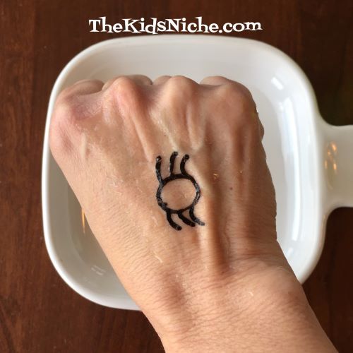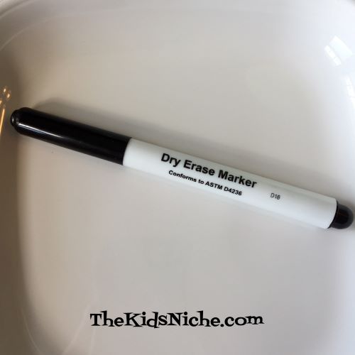 Here is a kid-tested-really-awesome experiment that you’ll have fun trying out with your kids! Making water tattoos is something I had never heard of until last night when 2 of our grandkids sent us some videos of their experiment making them. I’m so glad they shared this experiment with us because it looked so cool that I had to try it myself and now I want to share it with you! Here’s what you need: a white plate or dish, a dry erase marker and some water.
