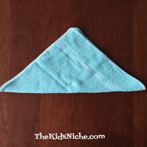 Grab one corner of the washcloth and take fold it across to the opposite diagonal corner so you have a triangle.