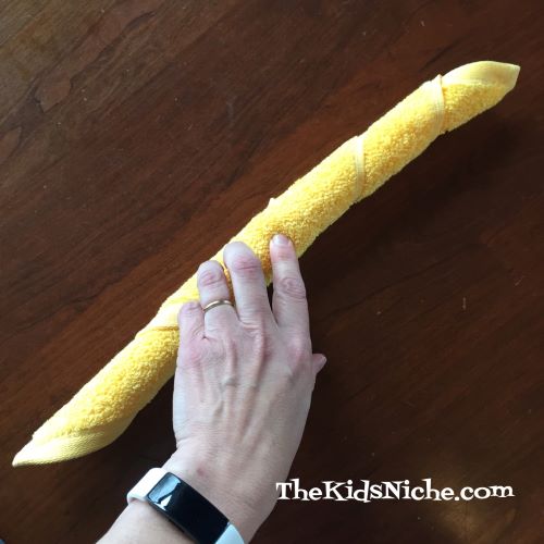 So let’s make one more washcloth animal! This little chick is quite adorable and fun! You’ll need 1 washcloth (a yellow one makes him super cute), 1 regular size rubber band, a piece of ribbon or twine, 2 wiggly eyes and a small piece of orange construction paper.