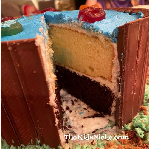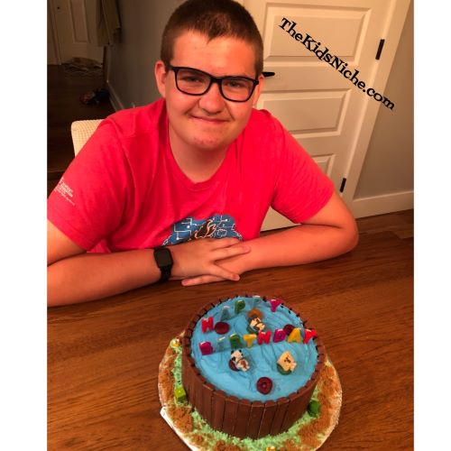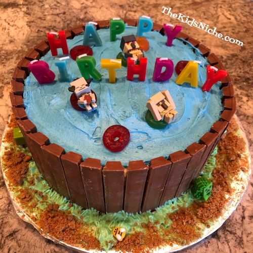 Ooops, I almost drooled on my keyboard! 😉 The outside of the pool is Kit Kat candy bar pieces. Some blue frosting for the water, some Lifesavers candy (Get it? Lifesavers in the pool…) with Minecraft characters floating in them plus some graham cracker crumbs around the bottom and this is one cute cake! I think it turned out great and I think Hunter looks like he thinks so too. 🙂