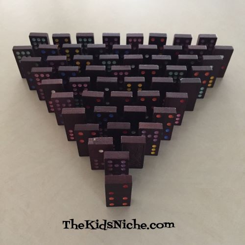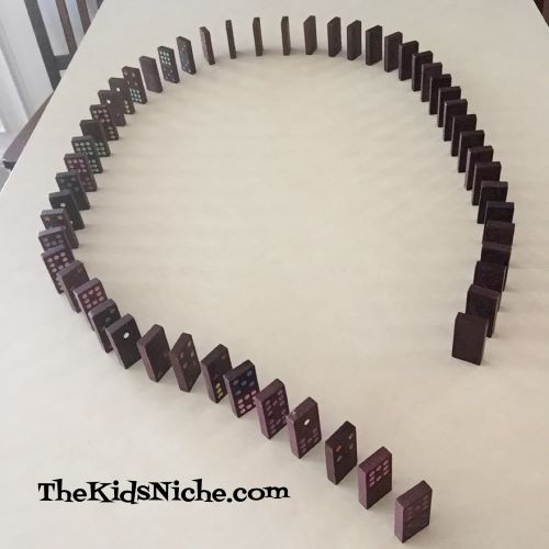 Have you heard about domino stacking? This is an activity that we used to do when I was little but I never knew it was called domino stacking until just a few days ago. The idea is to stand the dominoes upright on the end edge and line them up in such a way that when the first one is pushed over, it starts a chain reaction that causes all of the dominoes to fall down without anyone touching them. It’s a simple concept but it does take some patience and a steady hand to line the dominoes up correctly without bumping into one and setting the whole thing off before you are ready! LOL