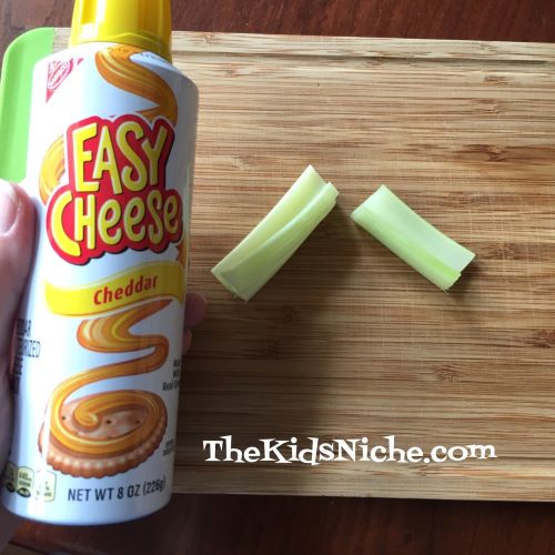 For our next test, let’s use some cheese. We tried a can of Easy Cheese. This one is rather fun because you get to make the cheese squirt out of the can into your celery. Try and keep it IN the celery, if you can! It’s a really warm day here so our Easy Cheese wanted to melt and run all over everything, so watch out for that!