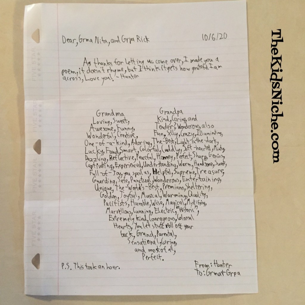 Do you write letters to your grandkids? Letter writing seems to be a thing of the past for a lot of people, but who doesn’t love to get mail? A hand written letter does something special to warm the heart and is appreciated by almost everyone. Not long ago, we received a very special letter from our grandson, Hunter. The grandkids had spent a week with us and Hunter wrote us a special thank-you note. Look at what he did: