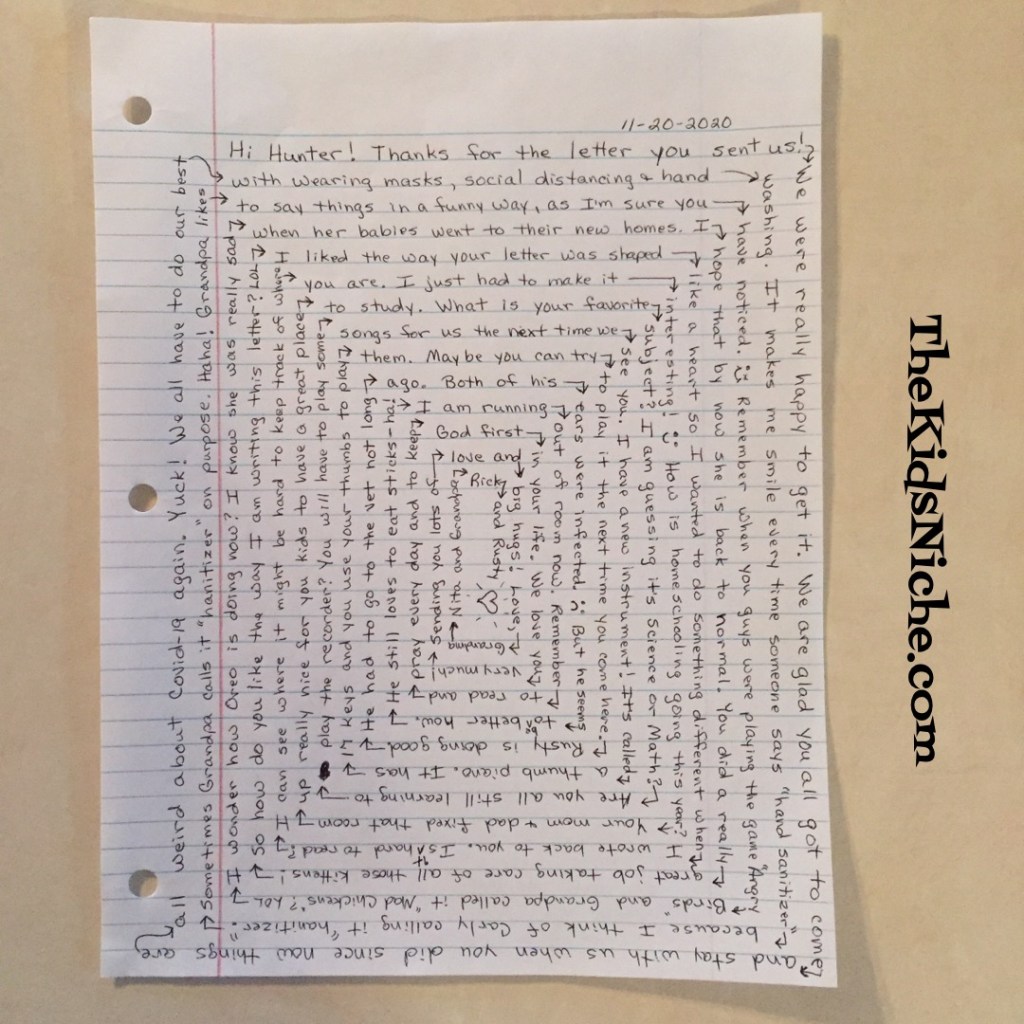 When Hunter gets his letter, he will have to turn the paper around and around to read it. 😉