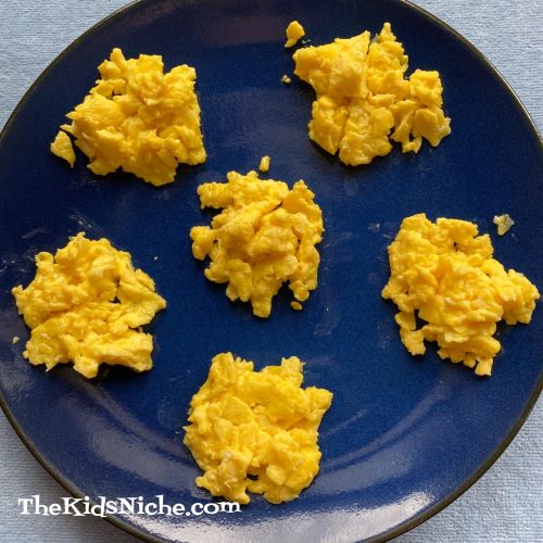 Aaaaaand here we go with Taste Testing Tuesday #18! Let’s take a look at toppings you can put on scrambled eggs to make them more appealing. Plain scrambled eggs can be quite tasty, but you have to admit, to a kid, they look pretty boring. Here are some ideas of ways to snazz them up a bit! (Is ‘snazz’ a word? Another form of snazzy?) I started out making a batch of scrambled eggs and then dividing them into 6 small sections on a big plate.