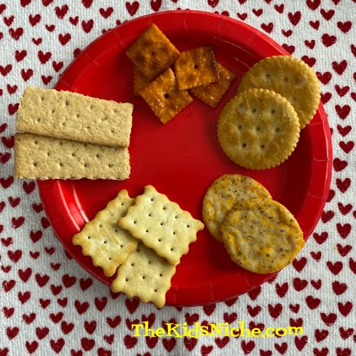 Hi everyone! How’s your Tuesday going? Kids going bonkers? Here’s a fun way to get them to sit still for a few minutes! Today’s Taste Testing Tuesday is all about crackers! So round the kids up for a quick silly snack and let’s get started! You can use whatever crackers you have on hand. Here are the 5 we taste tested.