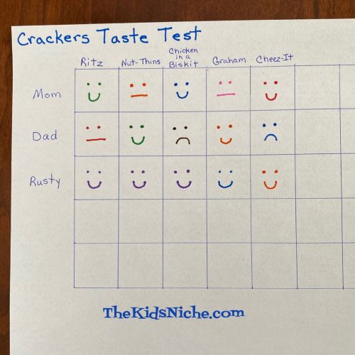 For added fun, draw a quick chart…nothing fancy…with a place for each person’s name and across from their name a place to draw a face for each kind of cracker. Something like this maybe: