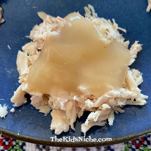 #2.) Gravy over Chicken. Open a premade jar of gravy for this one. You could also heat up some Bob Evans premade mashed potatoes to go under this kind of chicken. Or break up a piece of toast and top it with the chicken and gravy. Much better when heated.
