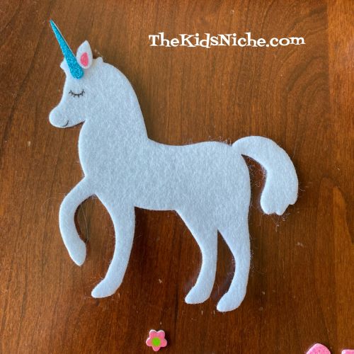 I placed her sparkly unicorn horn and her ear on.