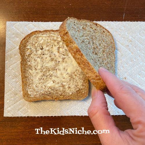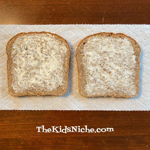 Yep, it’s a “real day”! (At least my phone says it is.) So what should you do on National Grilled Cheese Sandwich Day? Well, make a grilled cheese sandwich, of course! This is a great way to get kids started in the kitchen. So here we go! Grab some bread, your favorite cheese, some butter, a skillet and a spatula and let’s get cooking! Start by laying out 2 slices of bread.