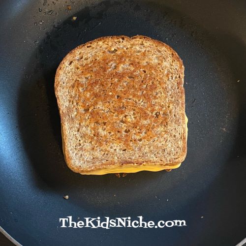 As your bread is getting brown and crispy, your cheese will be melting. When the second side is browned and the cheese is nicely ooey-gooey, turn off the skillet and put your yummy grilled cheese sandwich on a plate.