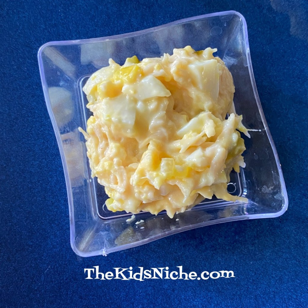 #1.). Egg salad. There are many ways to make egg salad but I make it using hard boiled eggs, mayonnaise (Miracle Whip), salt and a little onion powder.