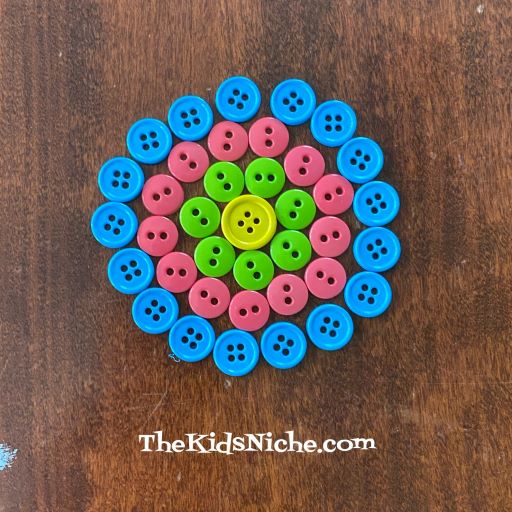 As a reward for counting and doing letters and numbers, give your child a bit of free time to make his/her own designs out of the colored buttons. Remember, all designs are GREAT and should be appreciated by others and not criticized. 😉