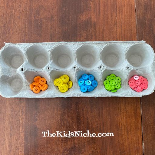 …and let your kids sort them into the little sections in an egg carton. The action of picking up each button is good for practicing fine motor skills and matching colors.