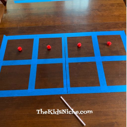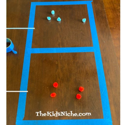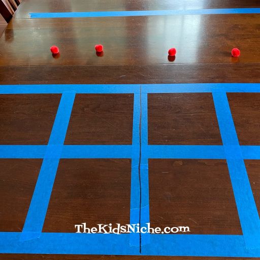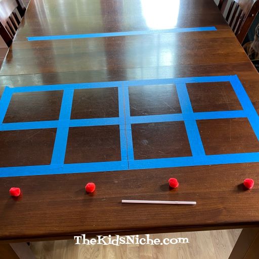 Now you are ready to play the easiest version of the game. Player #1 takes his/her pom poms and puts them on the end of the table by the first piece of tape.