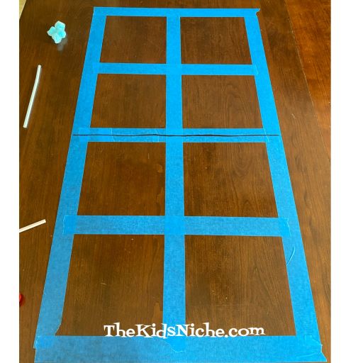 Ok, it’s getting harder now! Place more tape on the table so that each side has 4 small boxes. I drew a line down the center for a reminder to stay on your side. (Another side view)