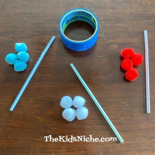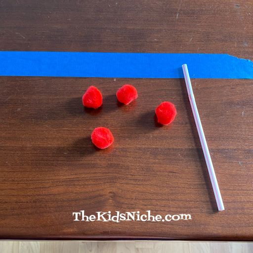 Do you ever wish you had something NEW the kids could do without going out and spending a ton of money? What if there was a game that takes some really simple supplies that you likely have on hand already? This game can be played with just some simple pom poms, drinking straws and either some painters tape or strips of paper and scotch tape. And a table or floor to play on. 😉