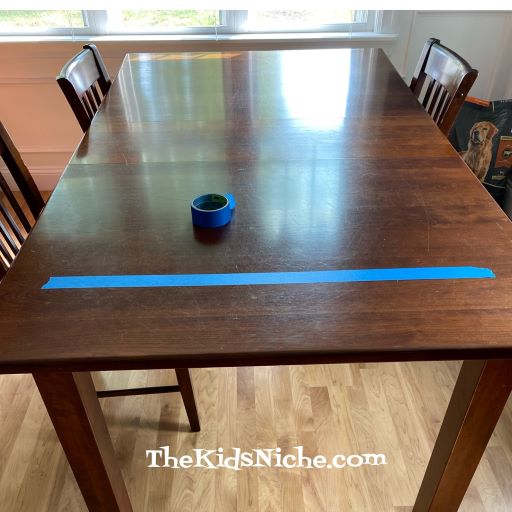 To set up the game, begin by placing a strip of painters tape across the table, close to one end but allowing 6″ or so of the table open on the very end. I suggest painter’s tape because it should come back up easily and not hurt the table. If you don’t have painters tape, you can use a strip of paper and tape it down with scotch tape.