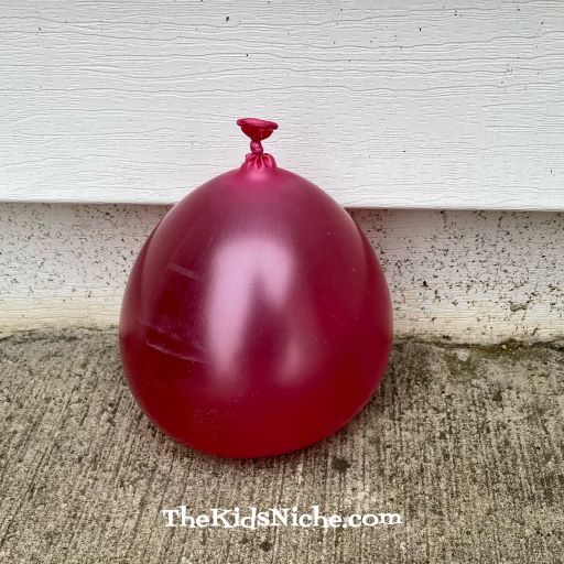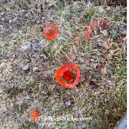 I decided I would just try 1 balloon since I was not having much success so far. I sat the red balloon outside on our little cement steps/porch so it could freeze overnight. The next morning, I checked the balloon and it felt solid! I thought I better move it into the grass before cutting the balloon off so I started to pick it up…aaaaand the balloon broke on it’s own. The best part was that the water was NOT frozen solid so when the balloon broke, the ice/water inside came gushing out all over the cement steps. (Fail #4) I grabbed as much of the ice as I could and dropped it into the grass. Where it, of course, broke into several pieces.