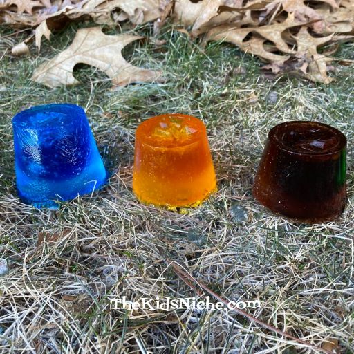 Wouldn’t you know, the temperature stayed above freezing for several days. (Fail #5) Finally last night the temperature got down to 18 degrees. 🙂 Tomorrow is supposed to be a warm day, so I hurried outside this morning to check on my cups of colored water. They were frozen! (Well, kind of frozen…)