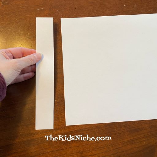 Continue with your project by cutting a small strip of cardstock paper between 1-2″ wide. I cut off the end of a full size sheet of cardstock (8.5″ x 11″).