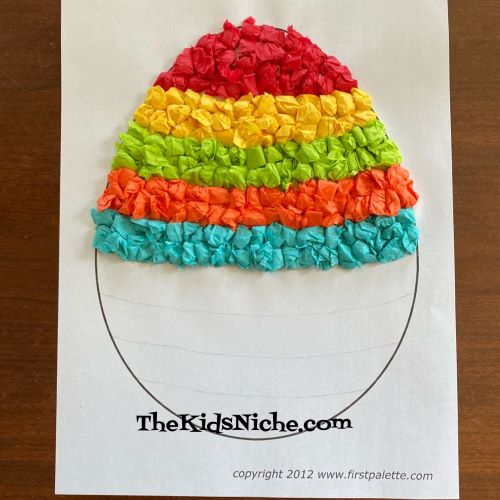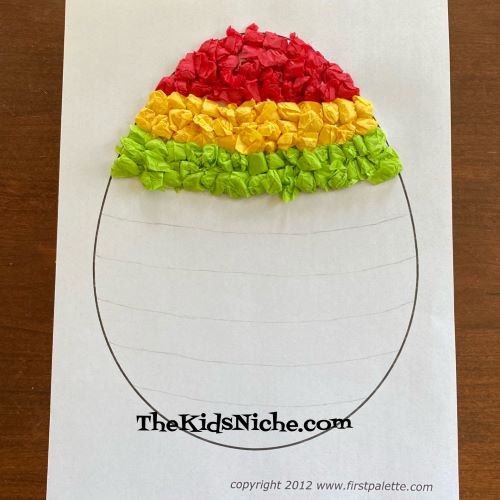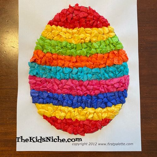 You’ll need a few colors of tissue paper, a piece of white paper, a pencil and glue. A computer and a printer will make it easier but isn’t necessary. To begin…draw the shape of an egg on the piece of white paper. Or do like I did and go to: