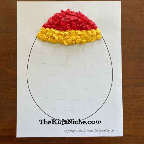Continue making paper balls and gluing them onto the egg shape. Press them close together so there isn’t much of the white paper showing through. I changed colors for each section but you can make your design however you like. Here is the first section done in red.