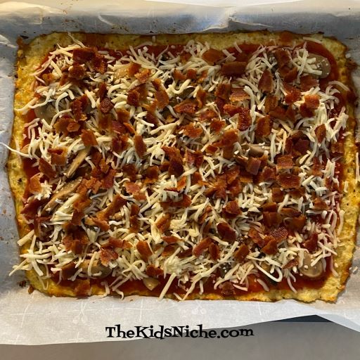 You will need 2 Cups of riced cauliflower (can be fresh or you can use the frozen riced cauliflower), 2 Cups of grated mozzarella cheese and 2 eggs…plus your sauce and pizza toppings. I started out following Dr. Eric Berg’s recipe but I have made a couple of changes. Dr. Berg uses fresh riced cauliflower, but I mostly use the Green Giant frozen Riced Cauliflower because its a big time saver.
