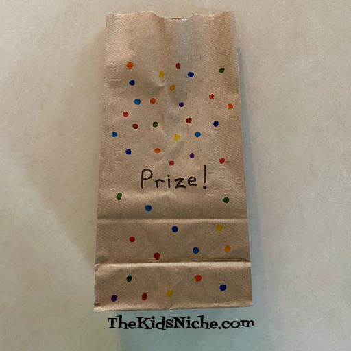 Prepare a prize for the end of the game before you actually start the game with the kids. You can just have the prize hidden somewhere they can’t find it or you can do like I did and make up a paper bag to hold the prize. I added colored dots to my bag just to spiff it up a bit.