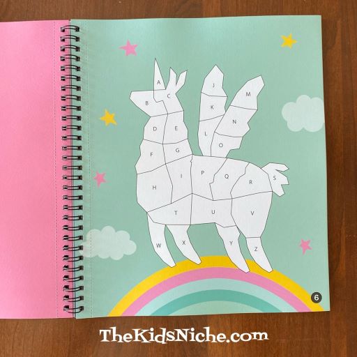Each magical creature has a page with the outline of the creature. Each outline is divided into smaller spaces and each space has a letter of the alphabet on it.
