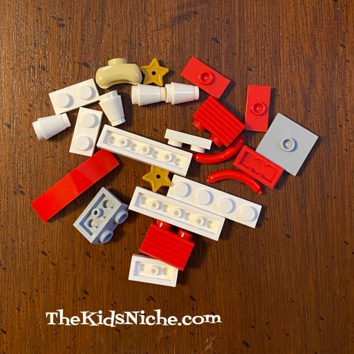 I have to admit again that the picture on the inside of the door has me stumped. That item isn’t made by the pieces inside door #3. Hmm…but pressing on…here are the pieces that ARE inside.