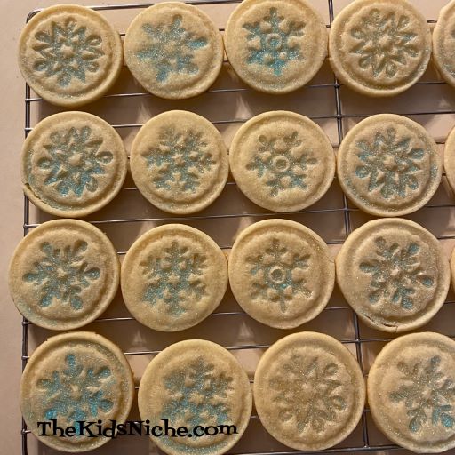 The recipe said to bake the cookies and then stamp them right away when you take them out of the oven. I wanted to add some colored sugar on the cookies and wondered if I should add the sugar before or after baking and stamping? So I tried one tray with the sprinkled on sugar before baking and one tray without. I found out that it doesn’t work to have sugar on the cookies before stamping. So forget that idea. The right way is to bake, stamp and then sprinkle. 😉 So here are the Snowflake Cookies.