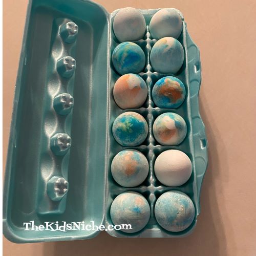 Let the eggs sit for 10 to 15 minutes. Then rinse in water. Sit the eggs on a paper towel to dry. Here’s a look at my eggs after they were dry.
