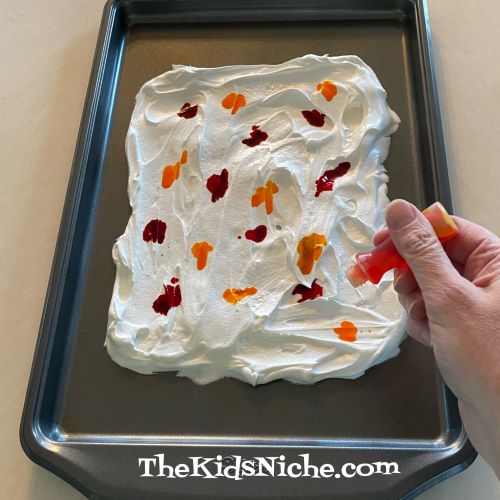 Put drops of different colored liquid food coloring all around the Cool Whip.