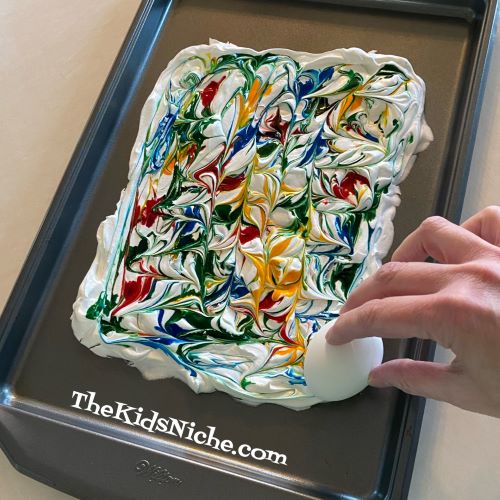 Roll the white hard boiled eggs through the colored Cool Whip and let the eggs sit on the cookie sheet. A word of warning…your fingers are going to be just as colorful as the eggs! 😉
