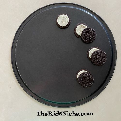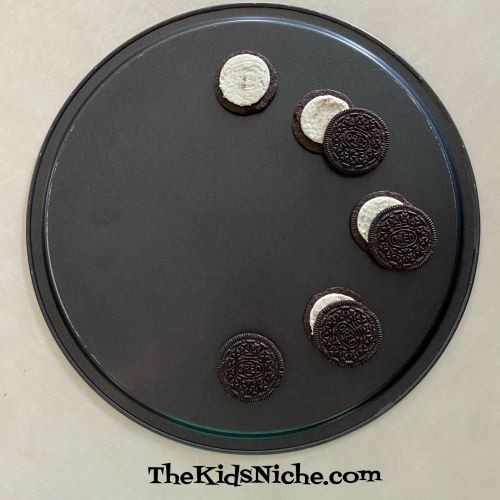 If the filling doesn’t completely stick to one side of the cookie, you can use a knife to put the filling all on one side. Now you’ll need something flat to lay the cookies on. Like a place mat, a plate or a pizza pan, etc. I’m using the backside of a pizza pan. Start with one cookie with the filling side up. This represents the sun before the eclipse starts.