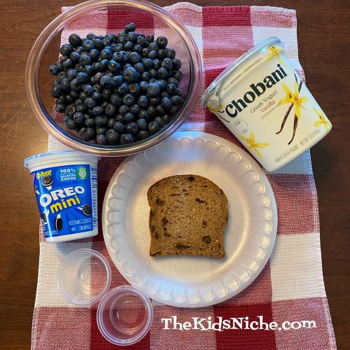 This is what you’ll need: a light colored plate (I used a white Styrofoam one), fresh blueberries, white yogurt (or cottage cheese, fruit dip, whip cream), 2 small cups or dishes, a piece of bread and some small cookies.